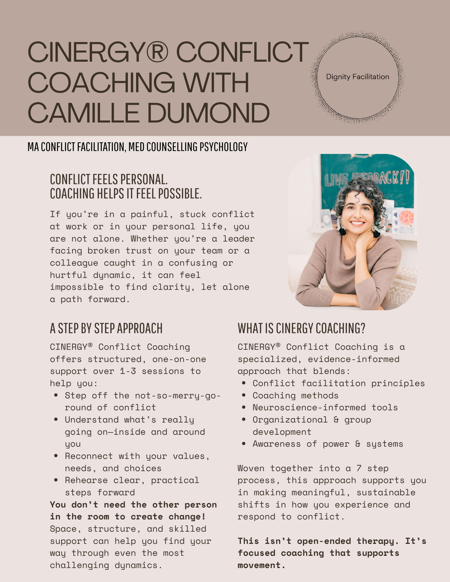When tension arises, whether at work or a personal relationship, it can feel like the problem is outside of you. Yet often, the outer conflict mirrors something happening inside. I help you tune in to what’s happening beneath the surface. By slowing down and getting curious about your own reactions, new possibilities begin to emerge. Together, we will approach the conflict as a source of insight rather than only a problem to eliminate.What to ExpectA calm, supportive and candid space to explore what’s happening inside and around youGuidance to stay present with strong emotions or uncertaintyTools to recognize and work with repeating patternsSpace for new perspectives, creative options, and genuine relief to emergeI use a variety of approaches, including process-oriented facilitation and CINERGY Conflict Coaching (see below).