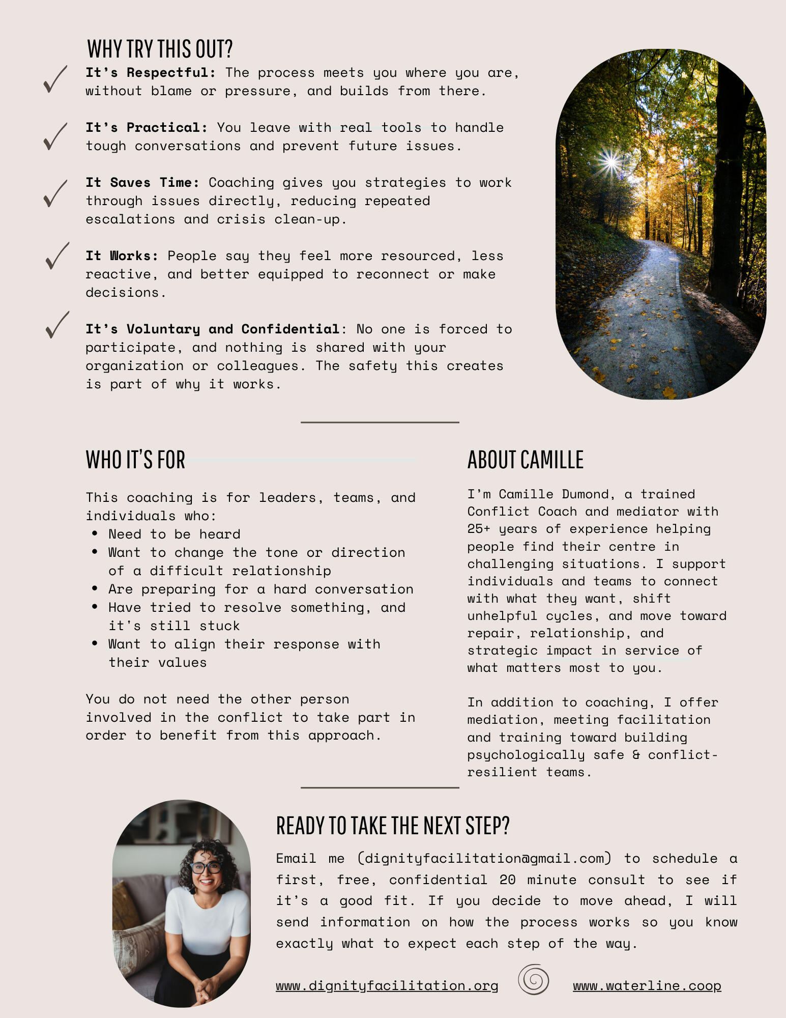 Living into my name, I work as a group facilitator, mediator, and conflict coach, helping people have the conversations that matter. My vision is that we find skillful ways to bring our deepest values to the conflicts of our times: allowing us to become a force for renewal, growth, and meaningful change in the world.In our work together, we’ll shine a light on everyday interactions to uncover patterns - developing the courage, tools and strategy to shift those that no longer serve us while drawing on the care and connection that already exist.We’ll build containers for dialogue: spaces where we can face difficulty with integrity, and practice the kinds of relationships we aspire to. This work cultivates not just skills, or concepts but an embodied sense of group life that feels integrated and humane. A space where we can experience both belonging and difference: talking about the things that matter with safety and candor.I draw on depth psychology, neuroscience, and alternative dispute resolution in my work. I hold an MA in Process-Oriented Conflict Facilitation, and MA in Adult Education, and an MEd in Counselling Psychology, am a CINERGY-trained conflict coach and certified Lewis Deep Democracy Level 1-3 Trainer, and am currently pursuing IMI Qualified Mediator (Q.Med) designation through the Canadian International Institute of Applied Negotiation.