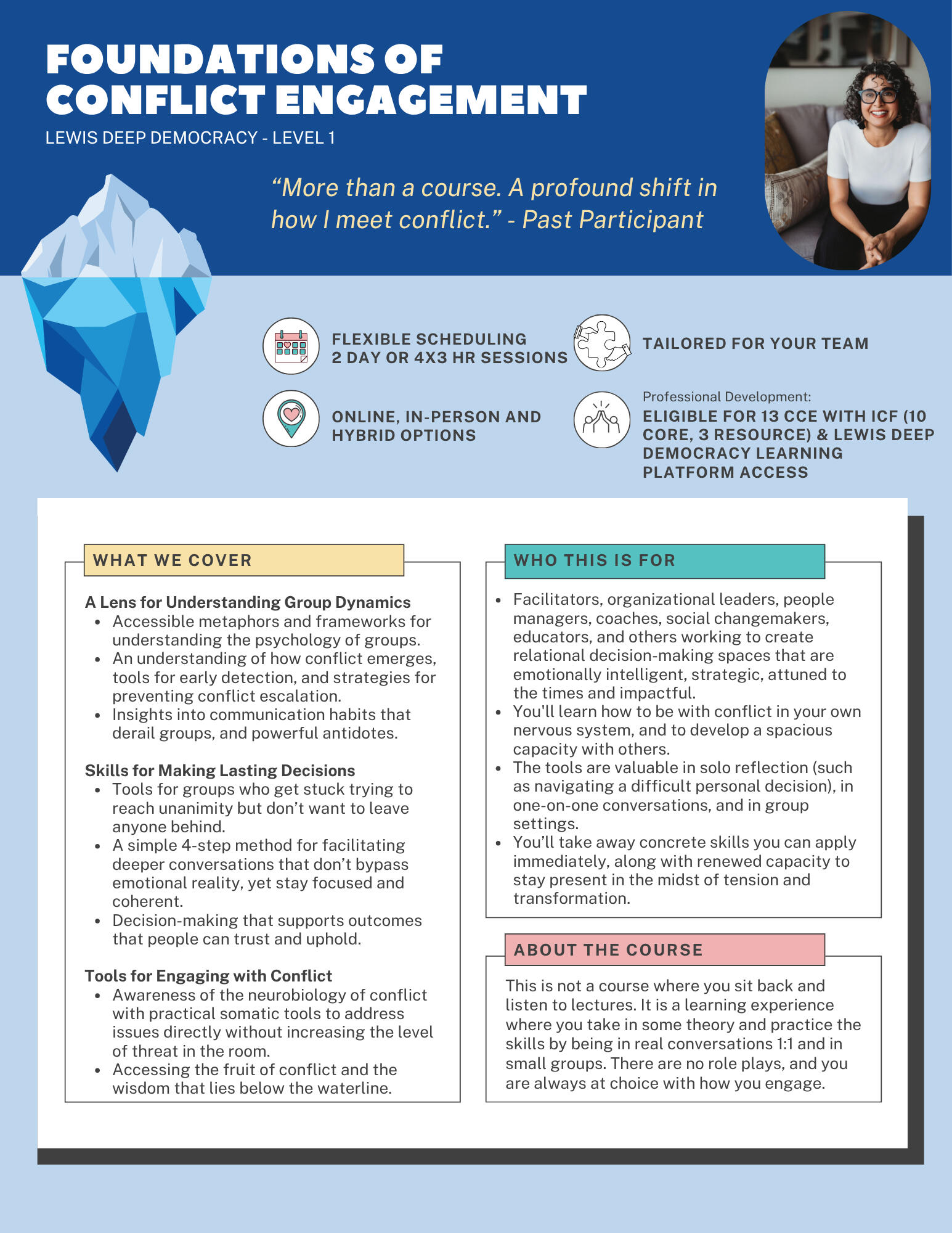 Want more clarity on a conflict you are facing? Try this free mapping tool. Take a few minutes to write or draw your answers to the questions. This is based on the tools we explore in our Level 1 Deep Democracy - Foundations of Conflict Engagement course.