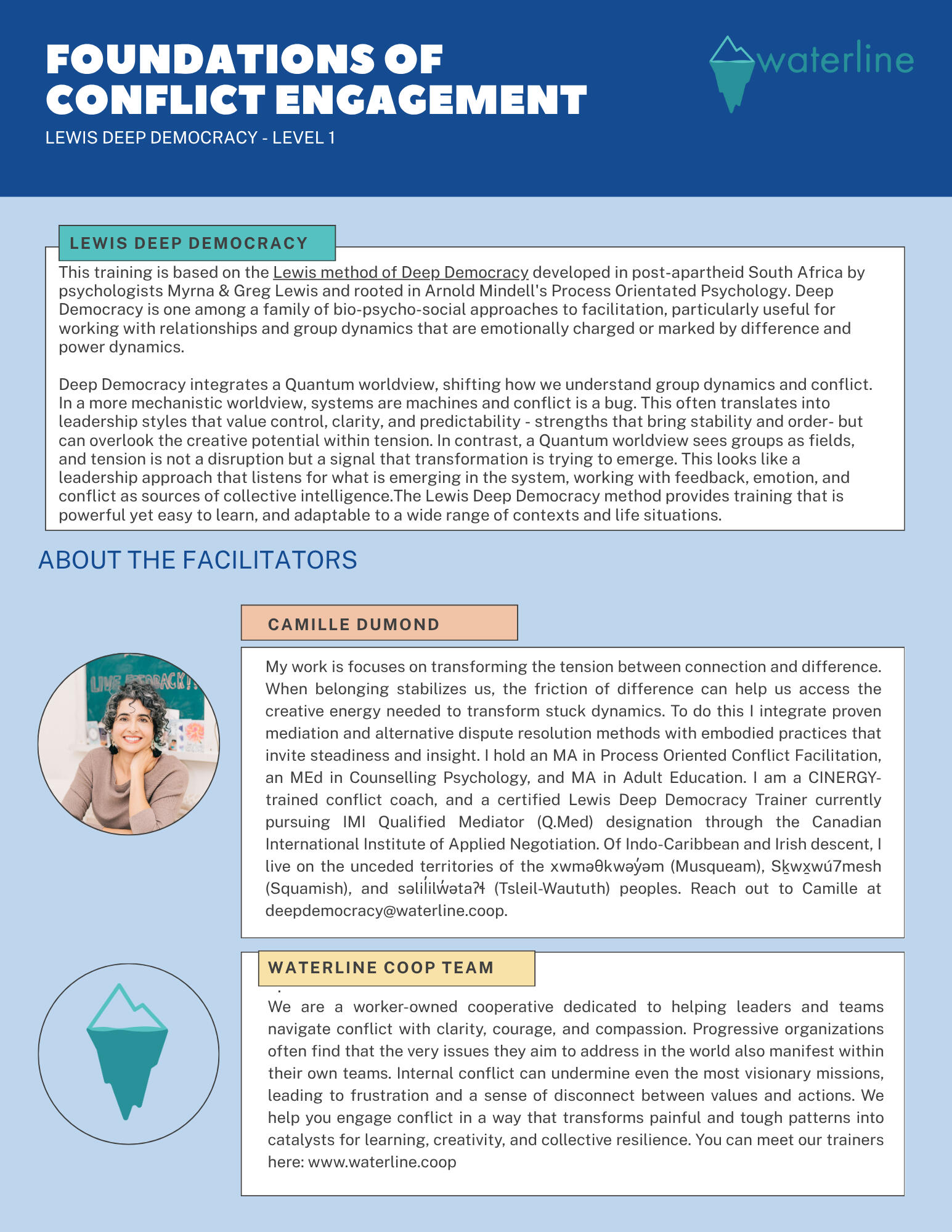 Living into my name, I work as a group facilitator, mediator, and conflict coach, helping people have the conversations that matter. My vision is that we find skillful ways to bring our deepest values to the conflicts of our times: allowing us to become a force for renewal, growth, and meaningful change in the world.In our work together, we’ll shine a light on everyday interactions to uncover patterns - developing the courage, tools and strategy to shift those that no longer serve us while drawing on the care and connection that already exist.We’ll build containers for dialogue: spaces where we can face difficulty with integrity, and practice the kinds of relationships we aspire to. This work cultivates not just skills, or concepts but an embodied sense of group life that feels integrated and humane. A space where we can experience both belonging and difference: talking about the things that matter with safety and candor.I draw on depth psychology, neuroscience, and alternative dispute resolution in my work. I hold an MA in Process-Oriented Conflict Facilitation, and MA in Adult Education, and an MEd in Counselling Psychology, am a CINERGY-trained conflict coach and certified Lewis Deep Democracy Level 1-3 Trainer, and am currently pursuing IMI Qualified Mediator (Q.Med) designation through the Canadian International Institute of Applied Negotiation.